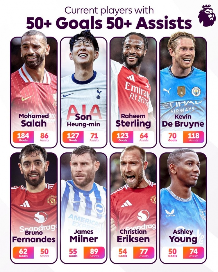官方統計當前仍效力英超進(jìn)球+助攻雙50+球員: