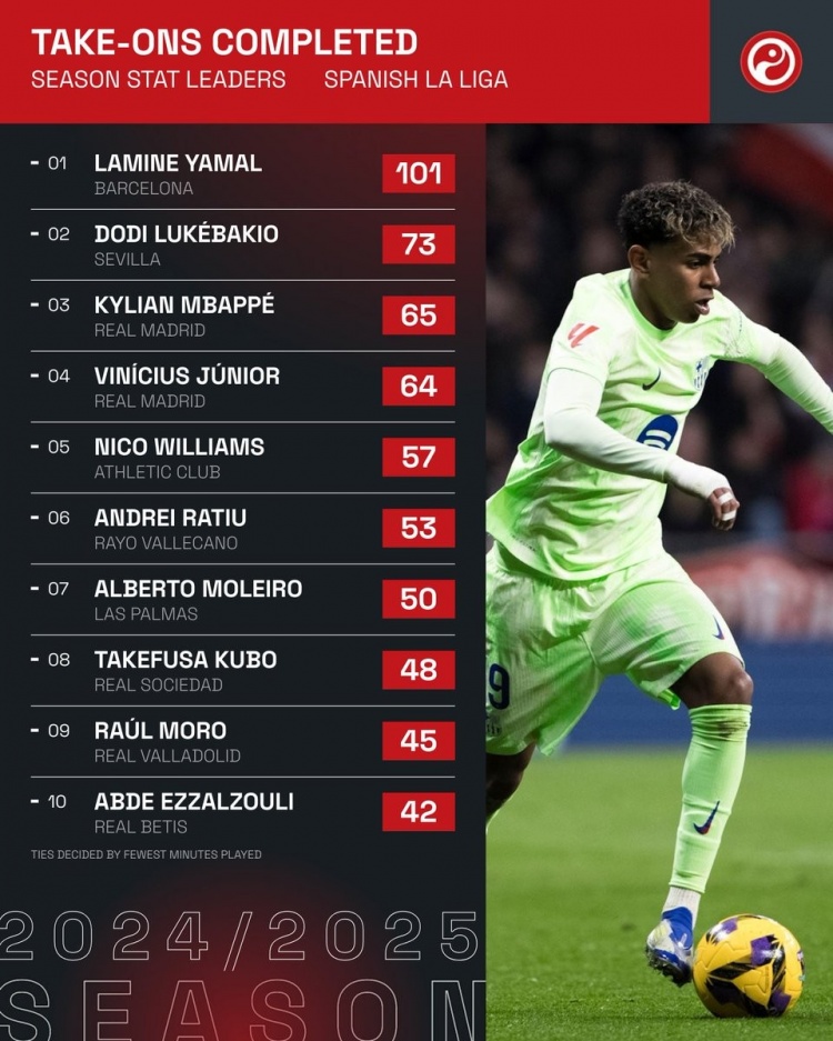 3月19日訊 國家隊比賽周到來(lái),西甲也暫時(shí)告一段落,squakwa統計了本賽季西甲成功過(guò)人情況,亞馬爾斷崖領(lǐng)跑。