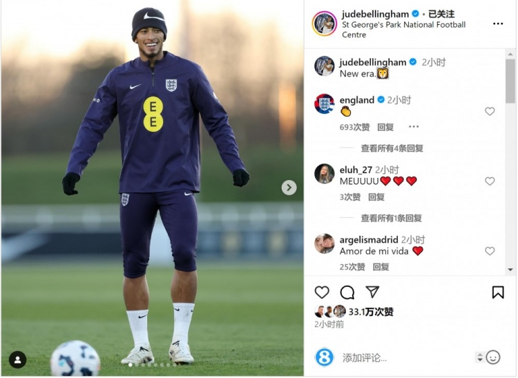 貝林厄姆隨英格蘭隊備戰世預賽,他在社交媒體上曬出訓練照片,并配文:“新時(shí)代????”