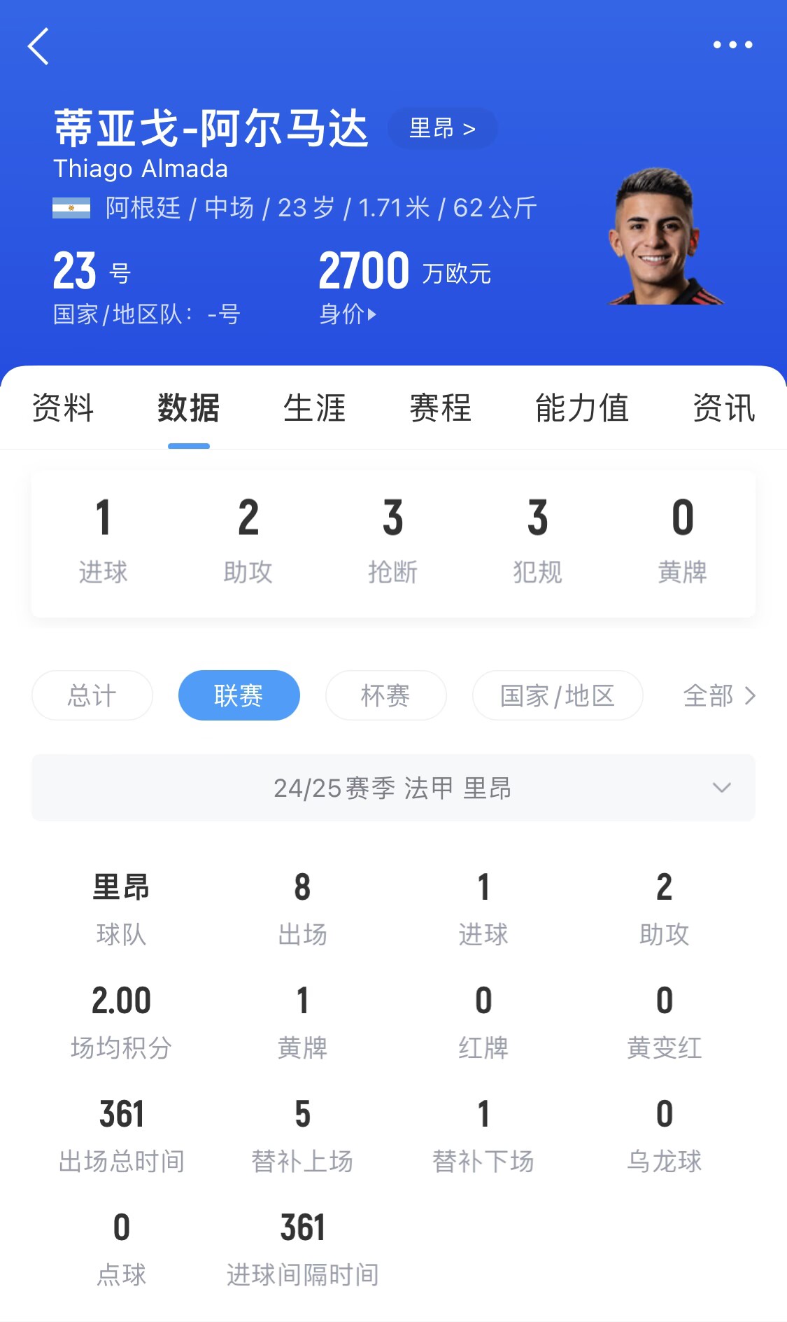 23歲的阿爾馬達今年租借里昂,3月16日剛收獲法甲首球,近兩場(chǎng)法甲1球2助,球員目前身價(jià)為2700萬(wàn)歐。