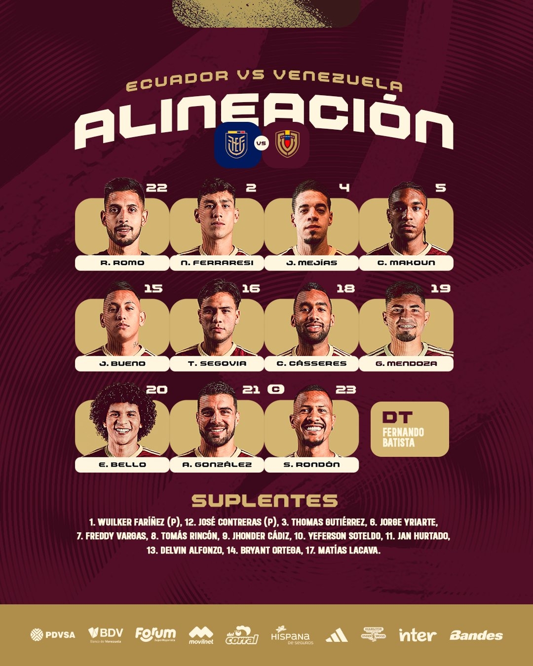 委內瑞拉首發(fā):22-羅莫、2-費拉雷西、4-梅伊亞斯、5-馬肯、21-亞歷山大-岡薩雷斯、19-門(mén)多薩、16-塞戈維亞、18-卡塞雷斯、20-貝洛、15-布埃諾、23-龍東