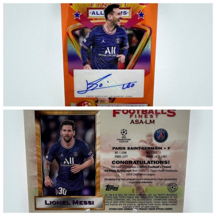 這張2021-22賽季Topps Finest Flashbacks UEFA Champions League Football’s Finest全明星簽名橙折射卡,全球僅印制10張。正面小字標注著(zhù)“Topps認證簽名版本”??ㄆ趁孢€提供了更多保證:“所有Topps簽名卡的簽署過(guò)程均有Topps代表現場(chǎng)監督,確保真實(shí)性?!边@張卡片潛在價(jià)值超過(guò)1000美元。