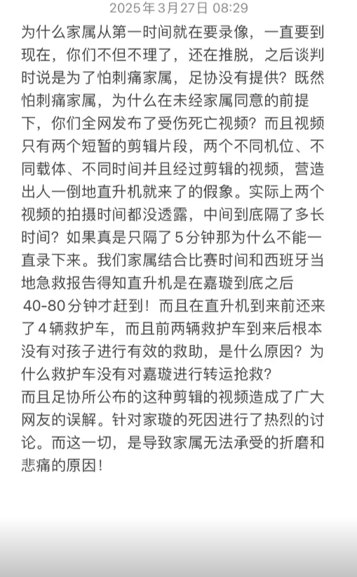 為什么家屬從第一時(shí)間就在要錄像,一直要到現在,你們不但不理了,還在推脫,之后談判時(shí)說(shuō)是為了怕刺痛家屬,足協(xié)沒(méi)有提供?既然怕刺痛家屬,為什么在未經(jīng)家屬同意的前提下,你們全網(wǎng)發(fā)布了受傷死亡視頻?而且視頻只有兩個(gè)短暫的剪輯片段,兩個(gè)不同機位、不同載體、不同時(shí)間并且經(jīng)過(guò)剪輯的視頻,營(yíng)造出人一倒地直升機就來(lái)了的假象。實(shí)際上兩個(gè)視頻的拍攝時(shí)間都沒(méi)透露,中間到底隔了多長(cháng)時(shí)間?如果真是只隔了5分鐘那為什么不能一直錄下來(lái)。
