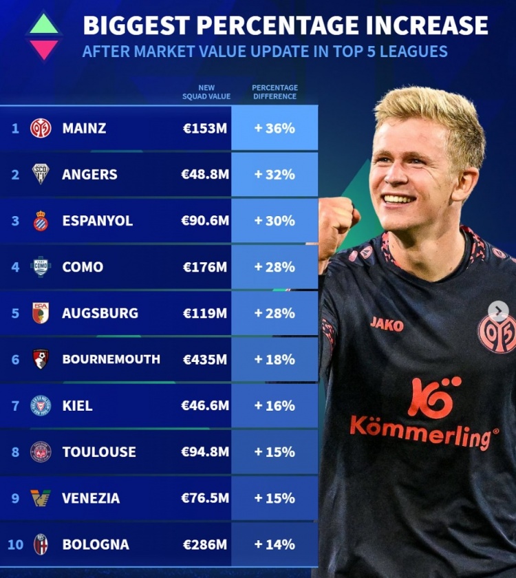 五大聯(lián)賽球隊身價(jià)貶值比例最高榜:歐元