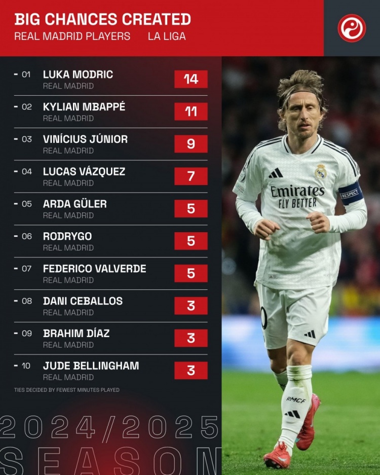 賽季至今,莫德里奇的出戰時(shí)間為1255分鐘,其中創(chuàng )造出了46次機會(huì ),14次創(chuàng )造出重大機會(huì ),收獲4次助攻。