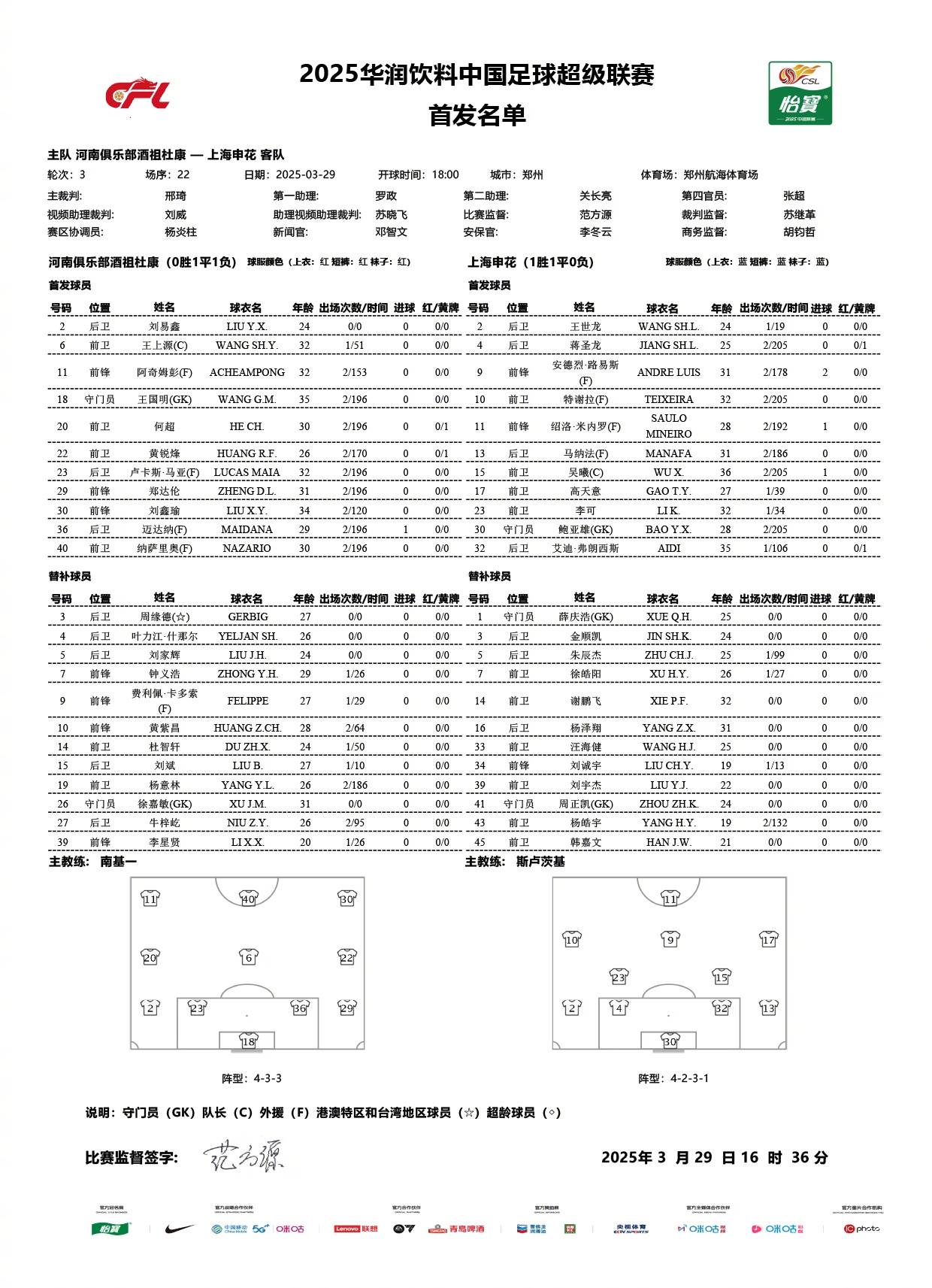 中超聯(lián)賽第3輪 河南俱樂(lè )部酒祖杜康vs上海申花 首發(fā)名單 ???-樂(lè )球直播