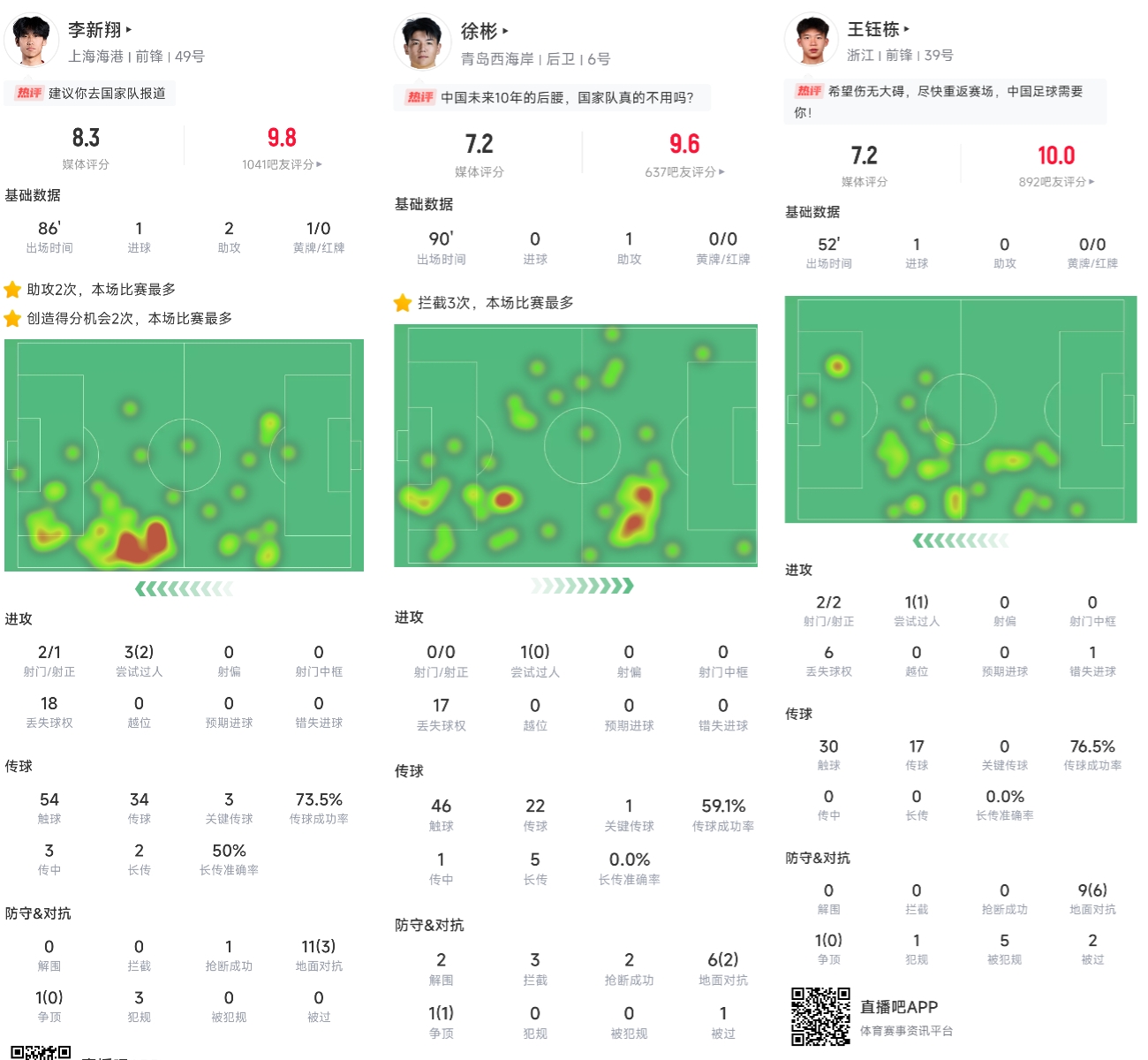 上海海港客場(chǎng)3-3戰平青島西海岸,19歲的海港小將李新翔首發(fā)迎來(lái)中超首秀,全場(chǎng)比賽1射2傳發(fā)揮亮眼,幫助海港搶下一分;青島西海岸20歲的后腰徐彬也表現出色,為阿齊茲送出一次助攻。