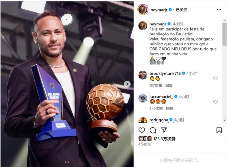 內馬爾在對陣國際里梅拉的比賽中的角球直接破門(mén)當選圣保羅州聯(lián)賽最佳進(jìn)球,他在社交媒體上曬出領(lǐng)獎?wù)掌?,配文:“很高興參加圣保羅州聯(lián)賽頒獎典禮,感謝圣保羅州足協(xié),感謝投票支持我的進(jìn)球的球迷,感謝上帝在我生命中所做的一切!”