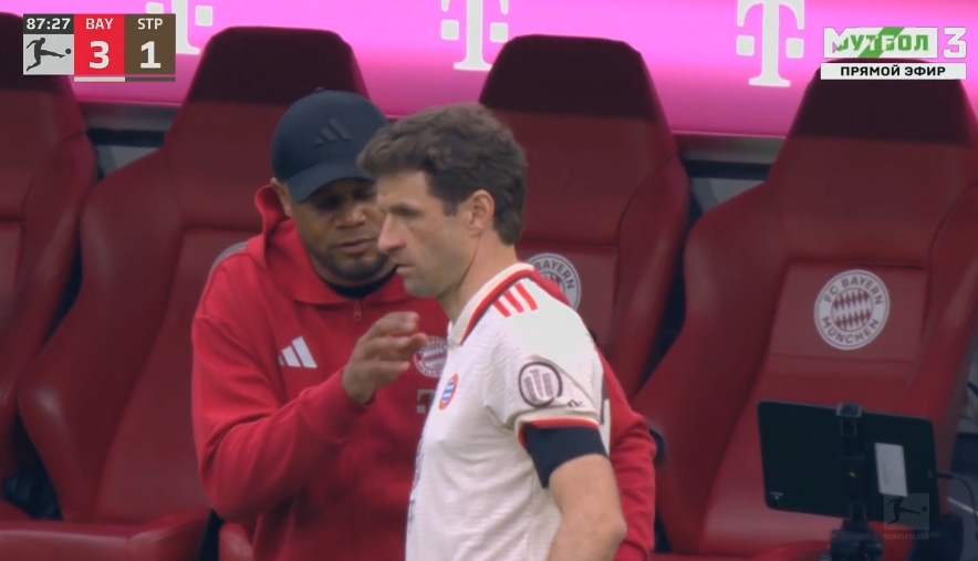 伊藤洋輝是第58分鐘替換格雷羅登場(chǎng)的,拜仁第85分鐘用完了最后的換人名額??着聊嵋裁靼走@一點(diǎn),他把穆勒叫到場(chǎng)面交代一下站位。
