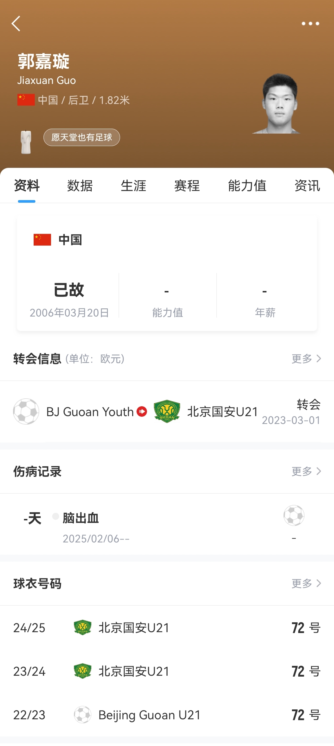 3月19日,國安小將郭嘉璇在天壇醫院去世,年僅18歲,當時(shí)距離他19歲的生日只有1個(gè)小時(shí)。