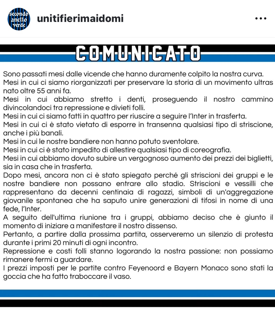 3月30日訊 國米北看臺球迷組織發(fā)布公告,宣布在之后每場(chǎng)比賽的前20分鐘保持沉默,抗議票價(jià)過(guò)高、主場(chǎng)禁止攜帶標語(yǔ)等情況。