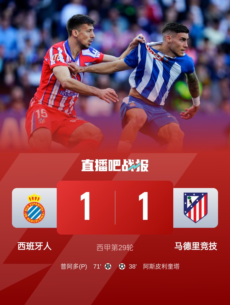 先賽距榜首6分!馬競1-1西班牙人3輪不勝 AZP世界波朗格萊送點(diǎn)
