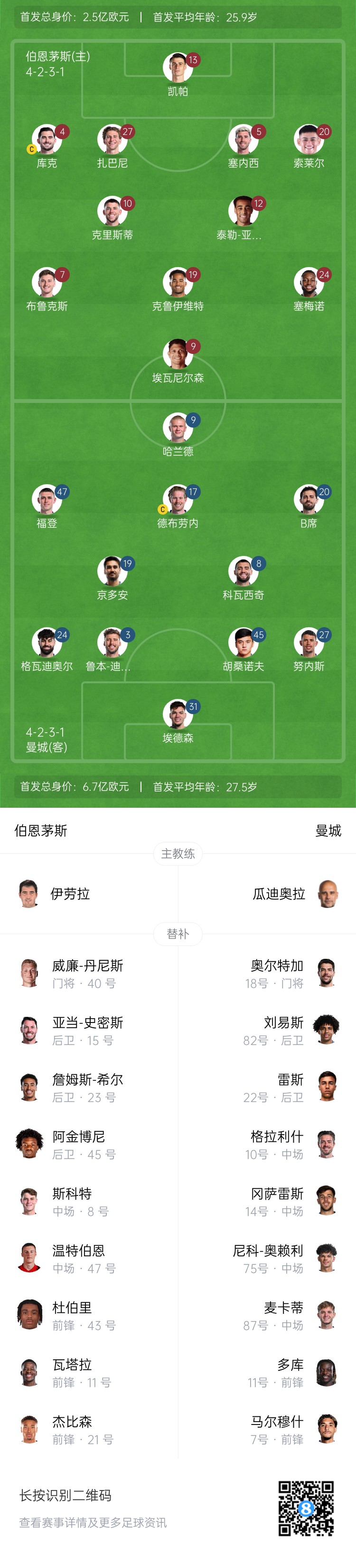 曼城首發(fā):31-埃德森、27-努內斯、45-胡桑諾夫、3-魯本-迪亞斯、24-格瓦迪奧爾、19-京多安、8-科瓦西奇、17-德布勞內、20-B席、47-福登、9-哈蘭德