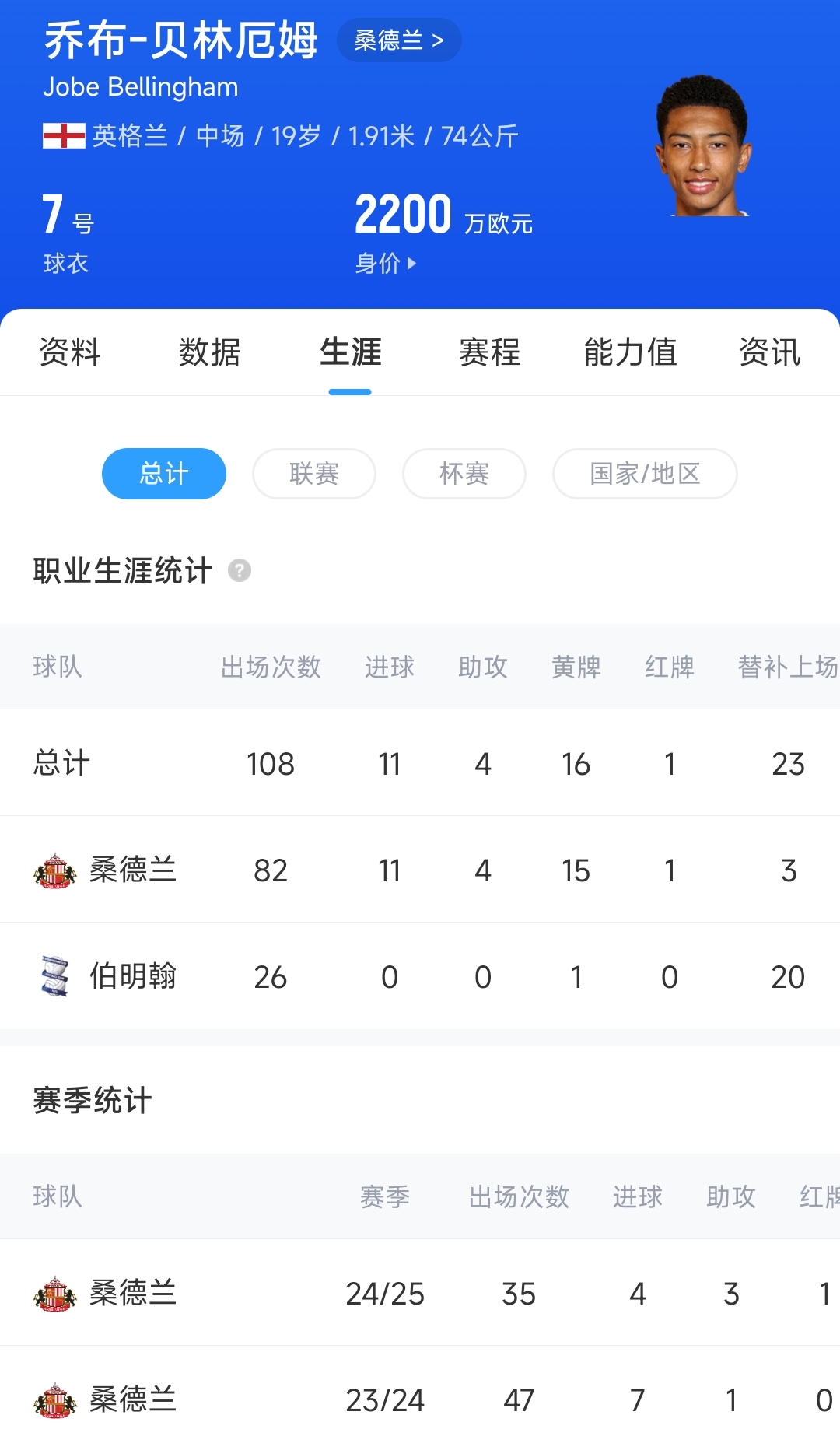 03月30日訊 日前德國轉會(huì )市場(chǎng)更新了英冠球員身價(jià),19歲的桑德蘭中場(chǎng)喬布-貝林厄姆身價(jià)上漲400萬(wàn)歐元,由1800萬(wàn)歐漲至2200萬(wàn)歐,排名英冠球員第一。
