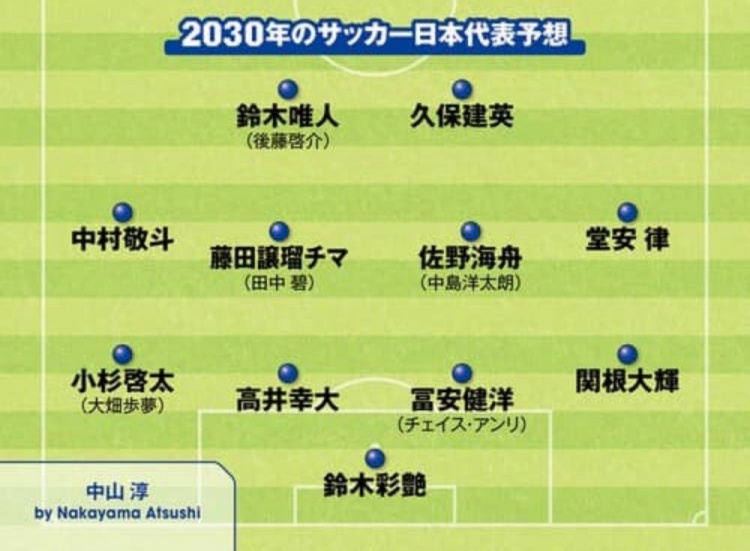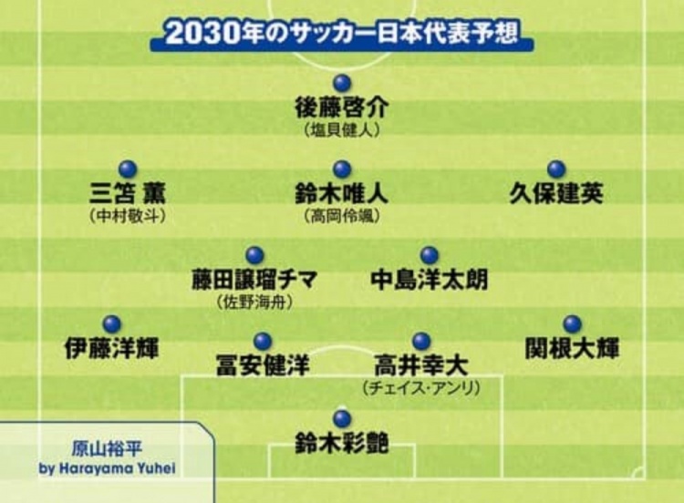 3月30日訊 據日媒Sportiva報道,近日該媒體開(kāi)設專(zhuān)欄,開(kāi)始對2030年世界杯日本隊首發(fā)陣容預測,有部分日本國內的自由撰稿人投稿對首發(fā)進(jìn)行預測。以上撰稿人預測的陣容中,基本都是本期日本國家隊陣中的年輕球員,并結合部分現役U22國家隊、U20國家隊球員等組合而成。