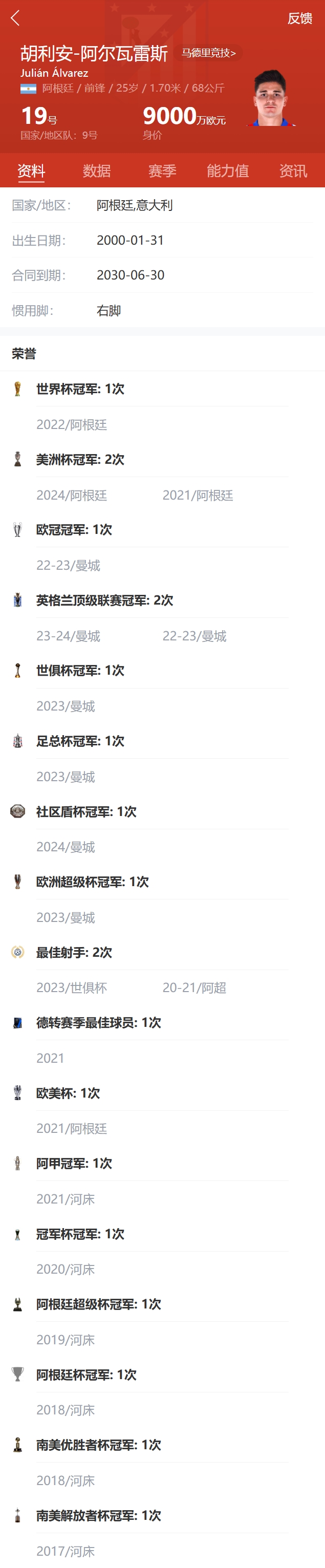 在本賽季之前,阿爾瓦雷斯已經(jīng)連續三個(gè)賽季斬獲聯(lián)賽冠軍。2021賽季,阿爾瓦雷斯隨河床奪得阿根廷職業(yè)聯(lián)賽冠軍,2022-23和2023-24賽季,阿爾瓦雷斯則隨曼城奪得兩座英超冠軍。