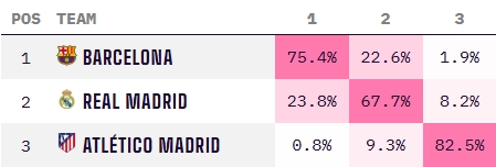 本輪西甲,馬競客場(chǎng)1-1戰平西班牙人,賽后多賽距離榜首已有6分之差。數據機構Opta給出的最新數據顯示,馬競本賽季西甲奪冠概率只剩下0.8%,基本可以宣布退出爭冠。