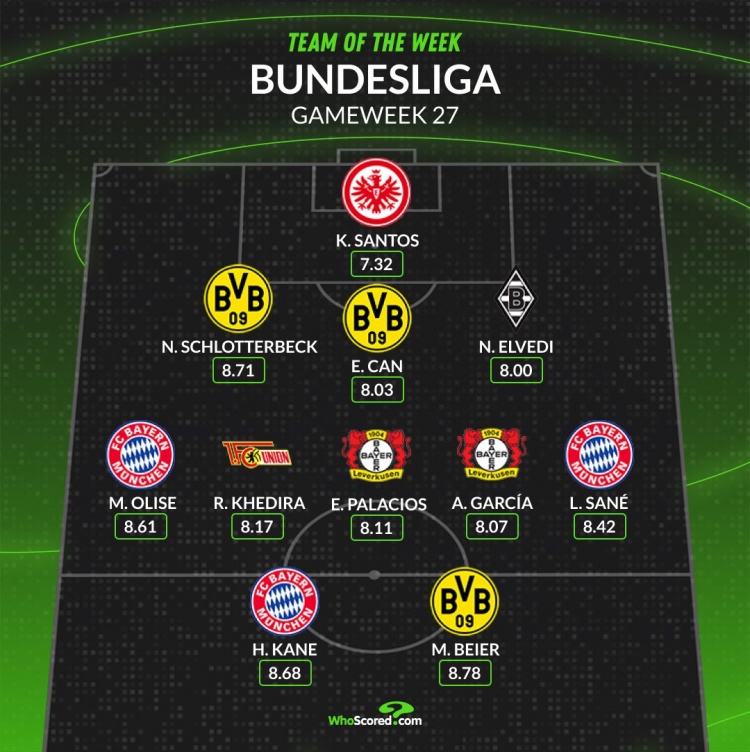 3月31日訊 德甲第27輪比賽戰罷,WhoScored根據球員評分列出了本輪最佳陣容,凱恩、薩內、奧利塞在列。