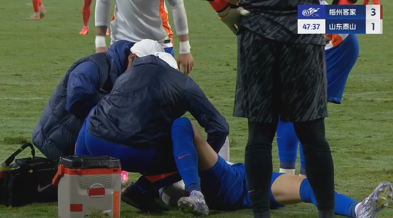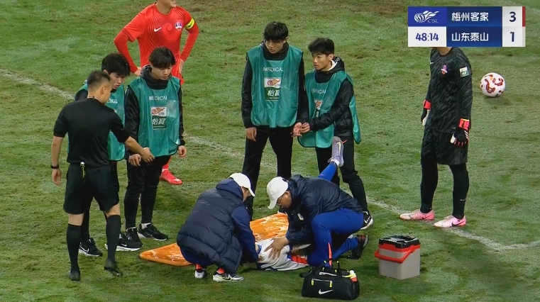 3月29日進(jìn)行的中超第3輪比賽,泰山vs梅州第50分鐘,王彤遠射后為了躲避封堵失去平衡摔地,隨后被擔架抬下,張弛替補登場(chǎng)。