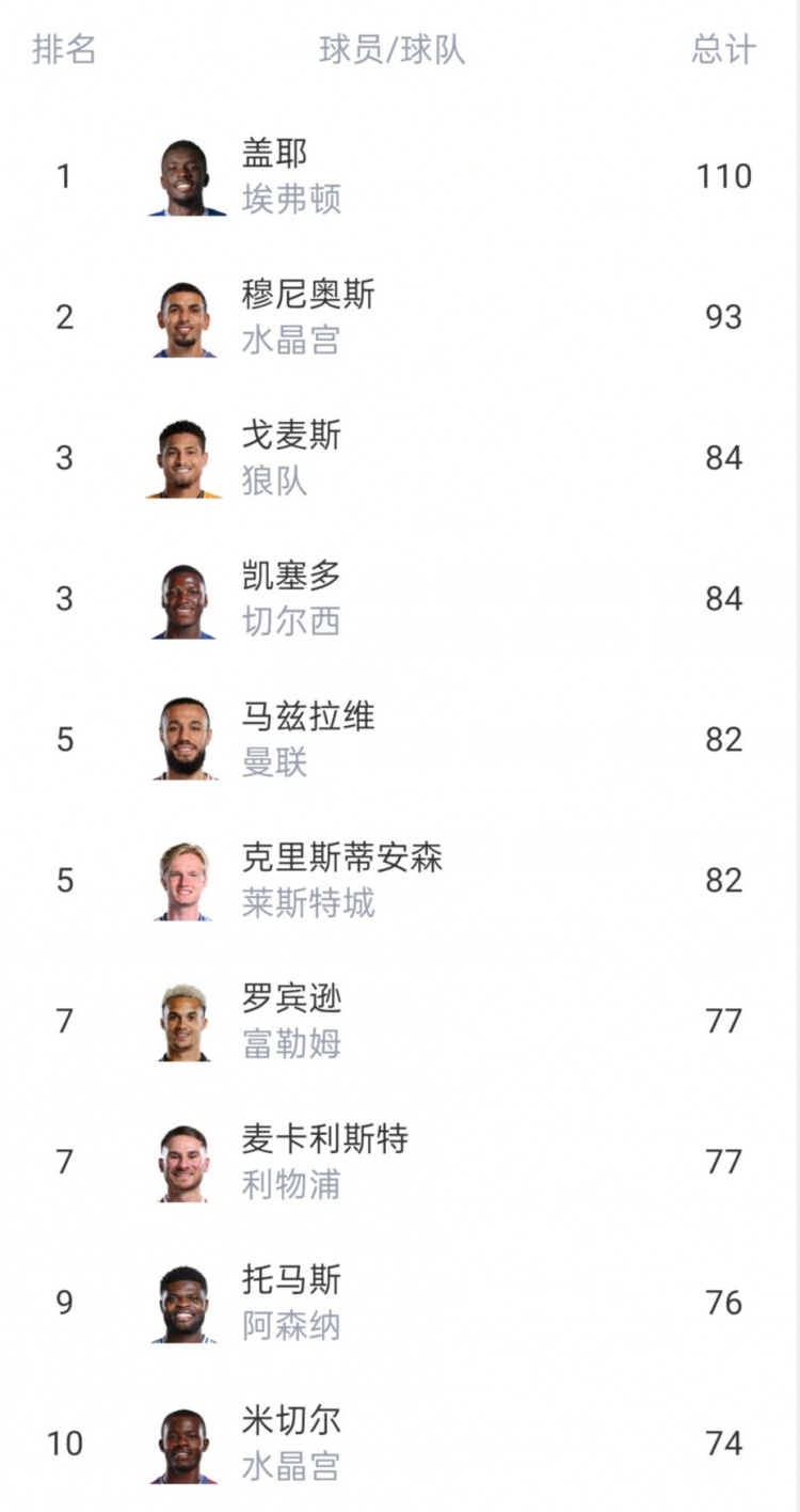 本賽季到目前為止,英超球員搶斷統計排名如下: