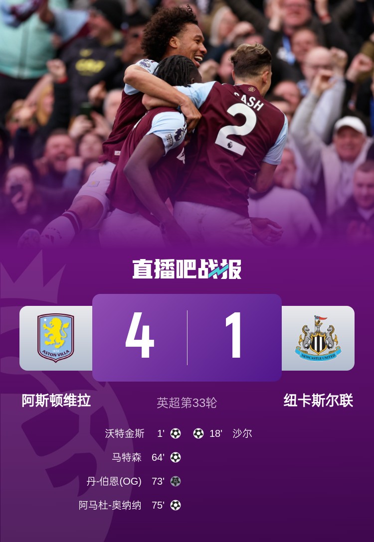 英超聯(lián)賽第33輪,阿斯頓維拉4-1大勝紐卡斯爾聯(lián),沃特金斯傳射,馬特森進(jìn)球。