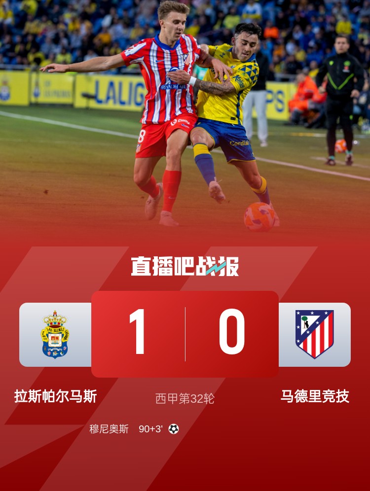 西甲聯(lián)賽第32輪,馬競客場(chǎng)0-1遭拉斯帕爾馬斯絕殺,落后巴薩10分。