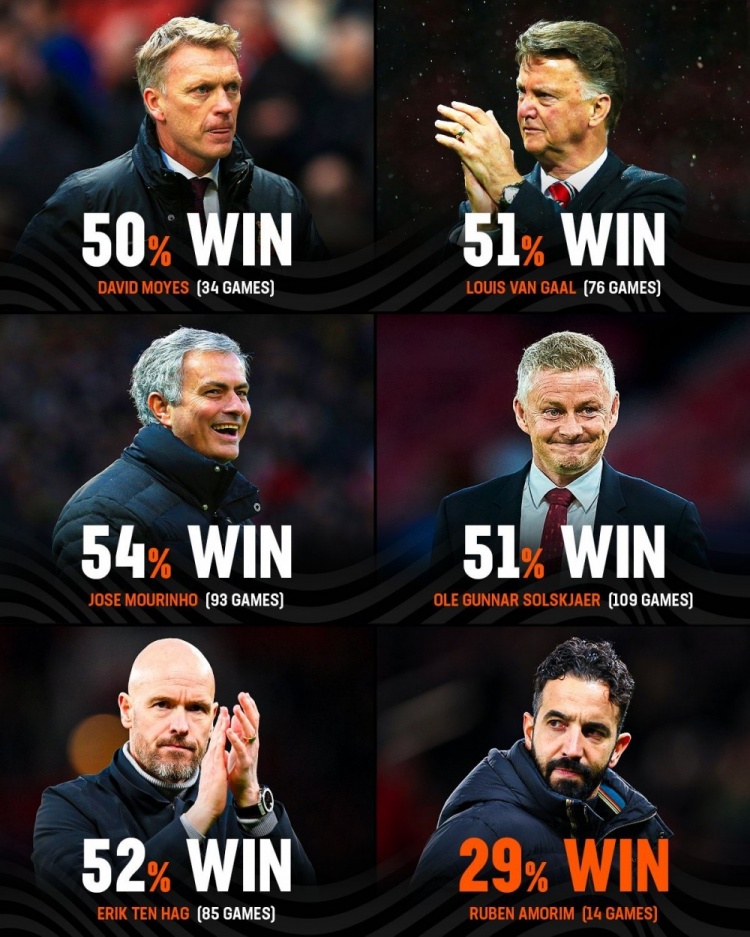 據統計,自接手曼聯(lián)以來(lái),阿莫林在英超中的勝率只有29%(14場(chǎng)4勝2平8負),是后弗格森時(shí)代曼聯(lián)所有正式教練中最低的。
