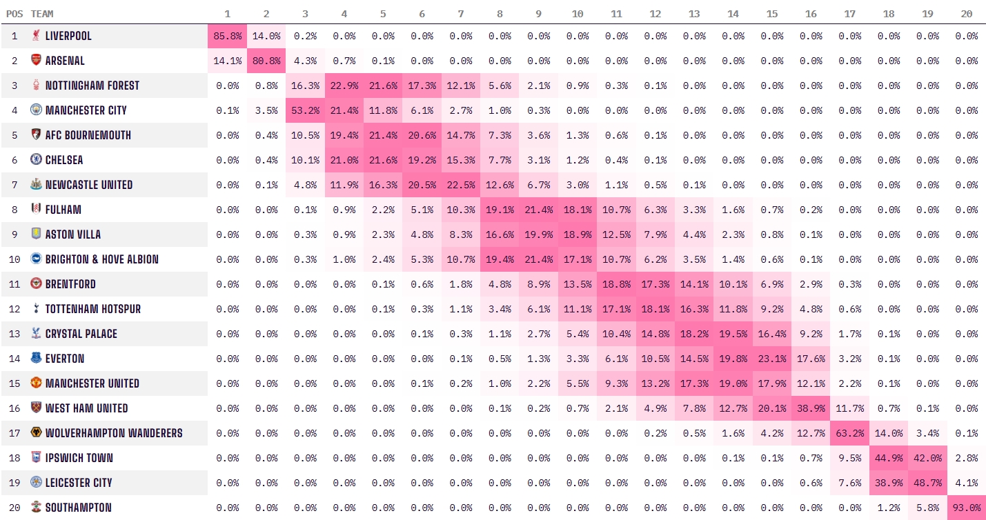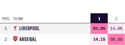 最新演算結果顯示,利物浦的奪冠概率為85.8%,大幅領(lǐng)先于阿森納的14.1%。