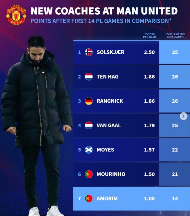 2月18日訊 曼聯(lián)在換帥后成績(jì)持續下滑,《轉會(huì )市場(chǎng)》統計顯示阿莫林是同期成績(jì)最差的主教練。