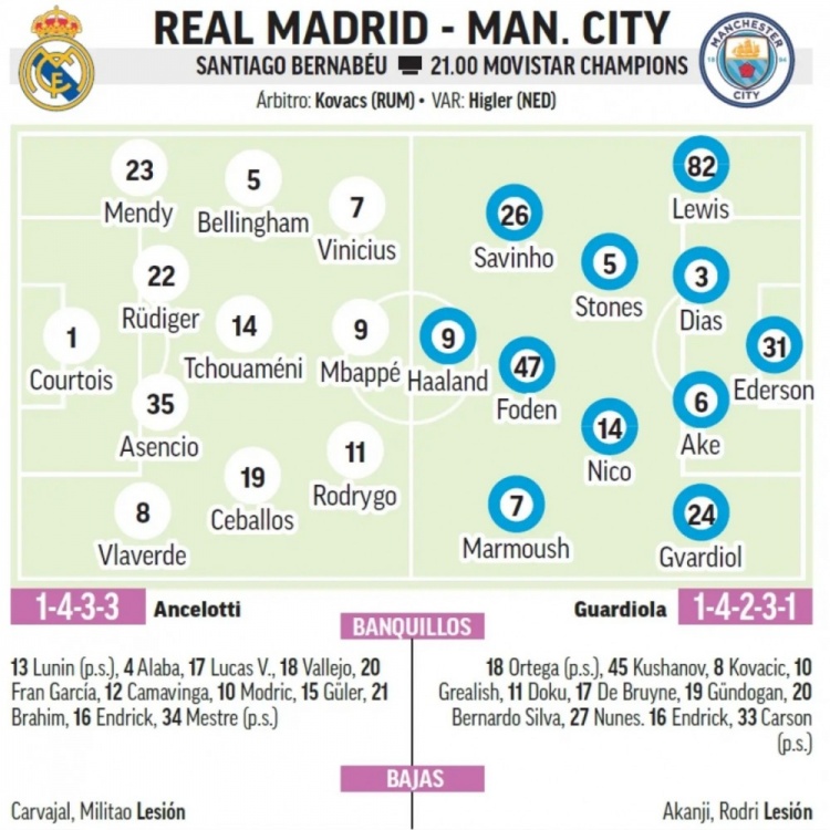 西班牙媒體《馬卡報》預測了兩隊此役的首發(fā)陣容,皇馬中衛組合為呂迪格+阿森西奧,巴爾韋德出任右后衛。曼城方面馬爾穆什、尼科-岡薩雷斯、劉易斯首發(fā)。