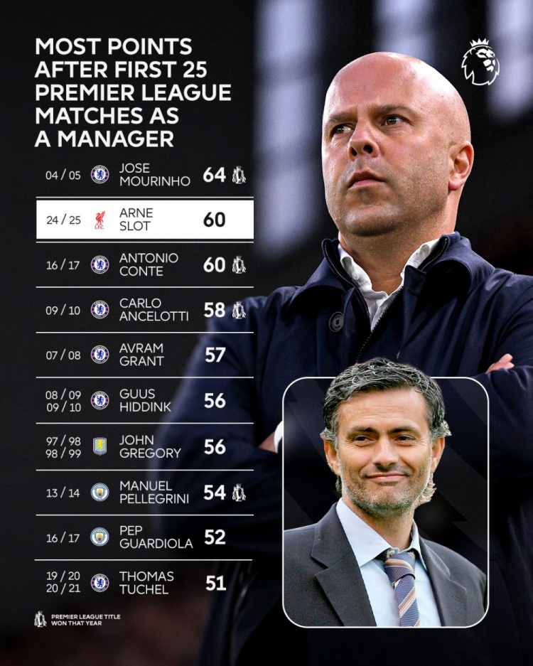 2月19日訊 英超官方統計了教練英超生涯前25場(chǎng)比賽的積分,并列出榜單,穆里尼奧64分居首,斯洛特、孔蒂60分次席,瓜迪奧拉52分排在第9位,前10名切爾西主帥占6席。