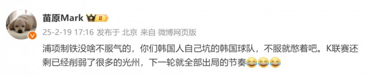 媒體人苗原發(fā)文表示:浦項鐵人沒(méi)啥不服氣的,你們韓國人自己坑的韓國球隊,不服就憋著(zhù)吧。K聯(lián)賽還剩已經(jīng)削弱了很多的光州,下一輪就全部出局的節奏。
