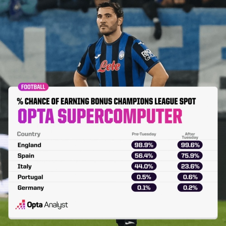 2月19日訊 在今天凌晨歐冠比賽后,Opta更新了獲得下賽季歐冠額外席位的概率,在米蘭和亞特蘭大被淘汰后,意甲的概率從44.0%降至23.6%。