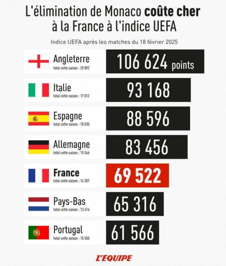 2月19日訊 《隊報》撰文表示,摩納哥在歐冠淘汰賽出局對法國的歐足聯(lián)系數排名造成不利影響,法國目前以69.522分位居第五。