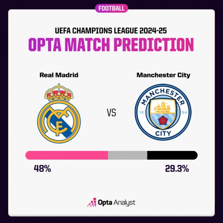 2月19日訊 北京時(shí)間明天凌晨4:00歐冠淘汰賽附加賽次回合,皇馬將在主場(chǎng)迎戰曼城。賽前,知名足球數據機構Opta利用超級計算機預測了比賽,結果顯示皇馬有78.4%的概率晉級。