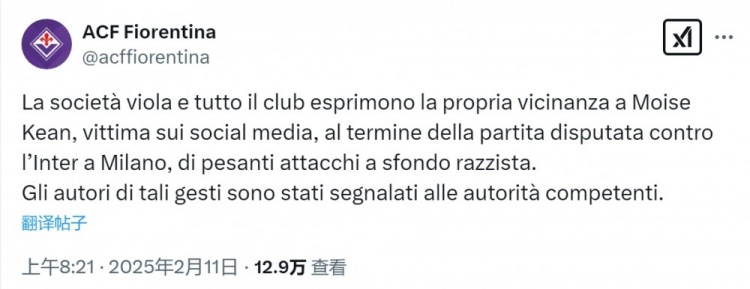 一些人在網(wǎng)上發(fā)布針對小基恩的種族主義內容,對此佛羅倫薩官方發(fā)表聲明:“佛羅倫薩俱樂(lè )部對小基恩表示支持和慰問(wèn),客戰國米的比賽后他在社交媒體上遭到嚴重的種族主義攻擊。這些攻擊行為的實(shí)施者已經(jīng)被報告給相關(guān)當局?!?/p>