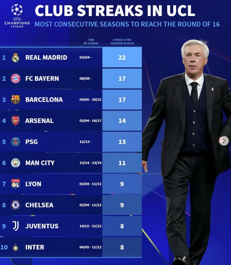 2月21日訊 皇馬在本輪歐冠附加賽雙殺曼城,成功挺進(jìn)歐冠十六強?!掇D會(huì )市場(chǎng)》也統計了歐冠歷史最長(cháng)連續晉級十六強榜單。