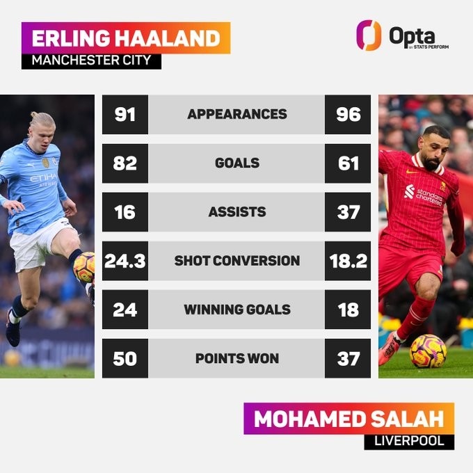 2月21日訊 OPTA統計了薩拉赫和哈蘭德過(guò)去三個(gè)賽季的進(jìn)球數據,兩人都在英超參與了98個(gè)進(jìn)球,分別為曼城和利物浦贏(yíng)得50分和37分。