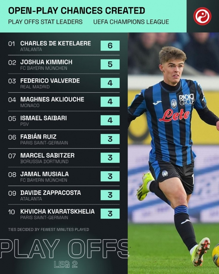 2月21日訊 根據Squawka統計,在歐冠淘汰賽附加賽次回合比賽中,亞特蘭大中場(chǎng)德凱特拉雷是運動(dòng)戰創(chuàng )造機會(huì )最多的,一共達到了6次。