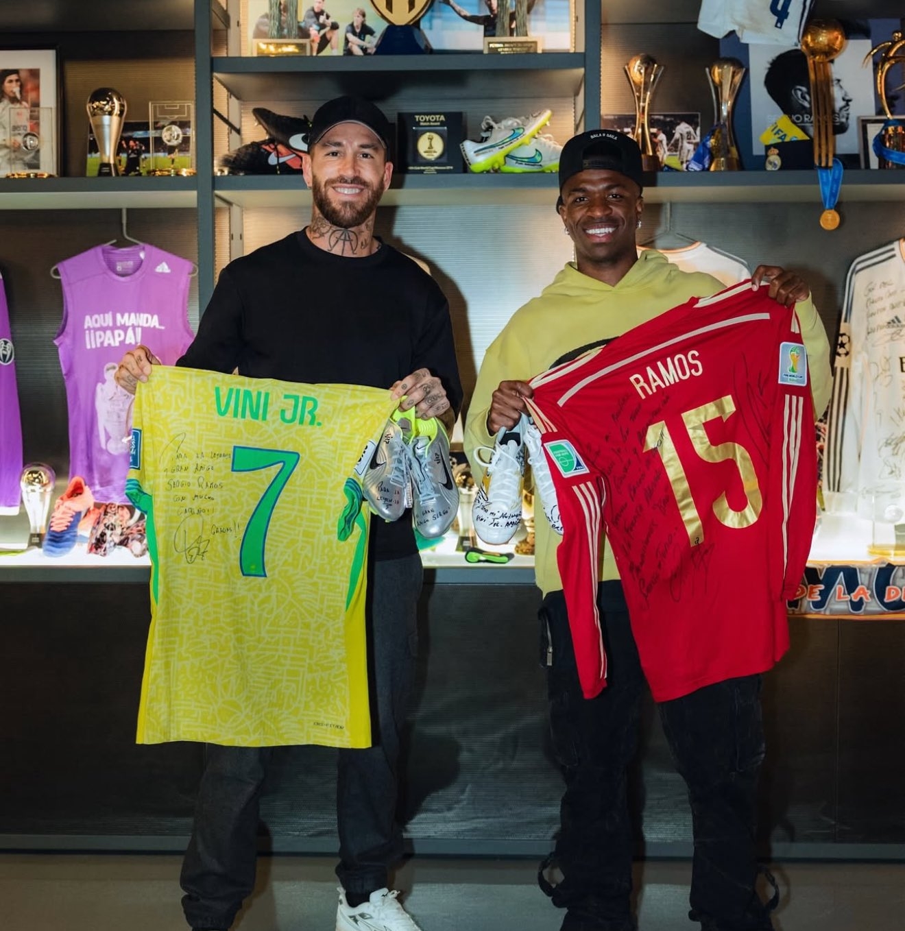 皇馬邊鋒維尼修斯也在近日拜訪(fǎng)了前輩拉莫斯的家,兩人交換國家隊球衣并合影留念。