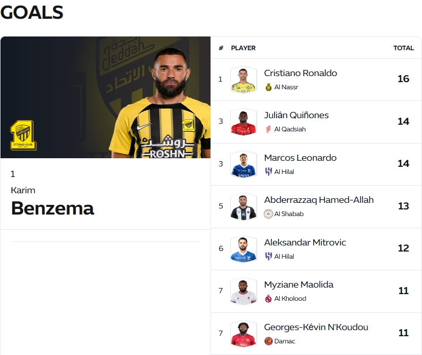 本場(chǎng)過(guò)后,本澤馬以18場(chǎng)16球的聯(lián)賽數據,登上沙特聯(lián)射手榜頭名的位置,他與C羅均打入16球。